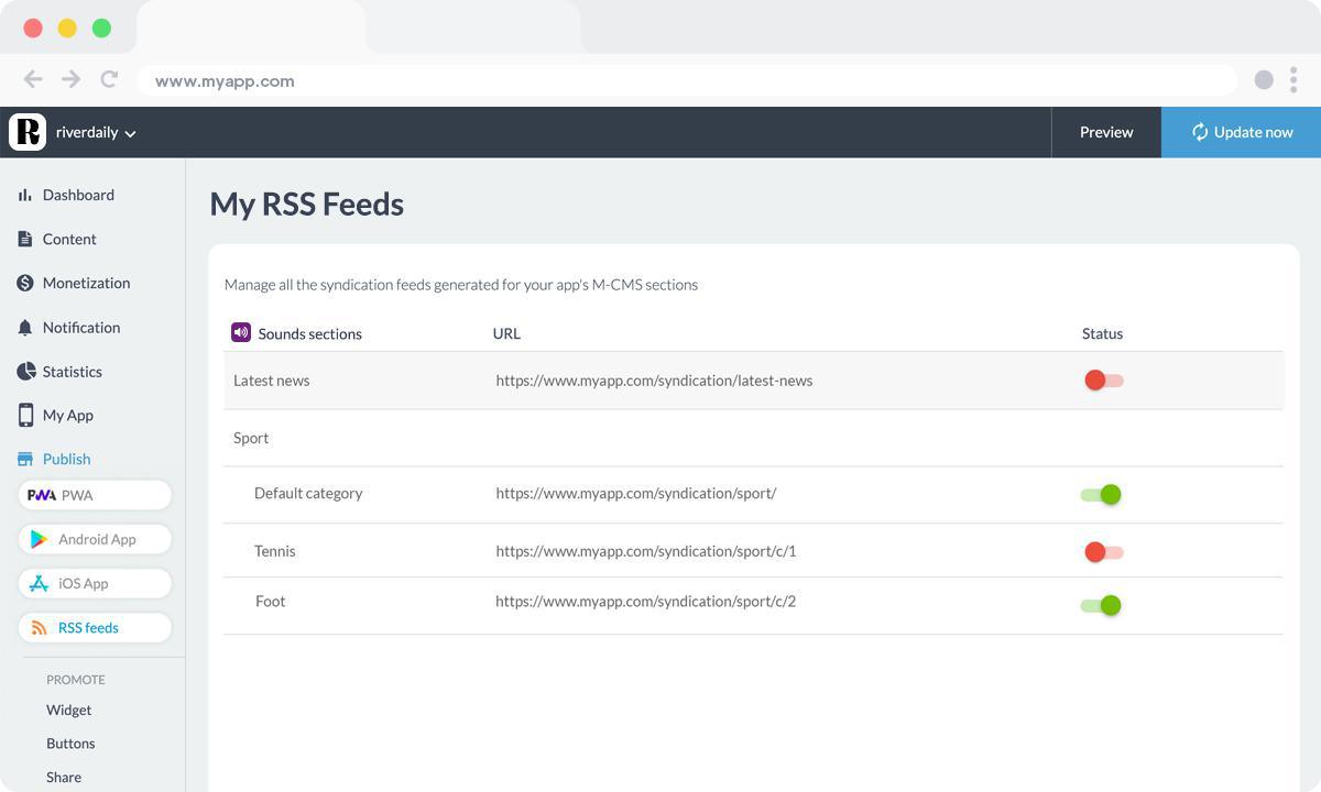 Your content feed is generated and updated automatically, so all you have to do is choose the distribution platforms and insert the link in your GoodBarber back office. By generating content feeds for different sections of your GoodBarber application, you can easily distribute your content to the external platforms of your choice, not only considerably increasing its visibility, but also simplifying the management of multi-site publications. RSS feeds offer exciting new ways of distributing your podcasts!