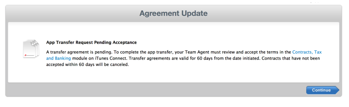 The recipient of the app must accept the transfer request within 60 days. When he logs in to his iTunes Connect account, a notification informs him that an app is in pending transfer.