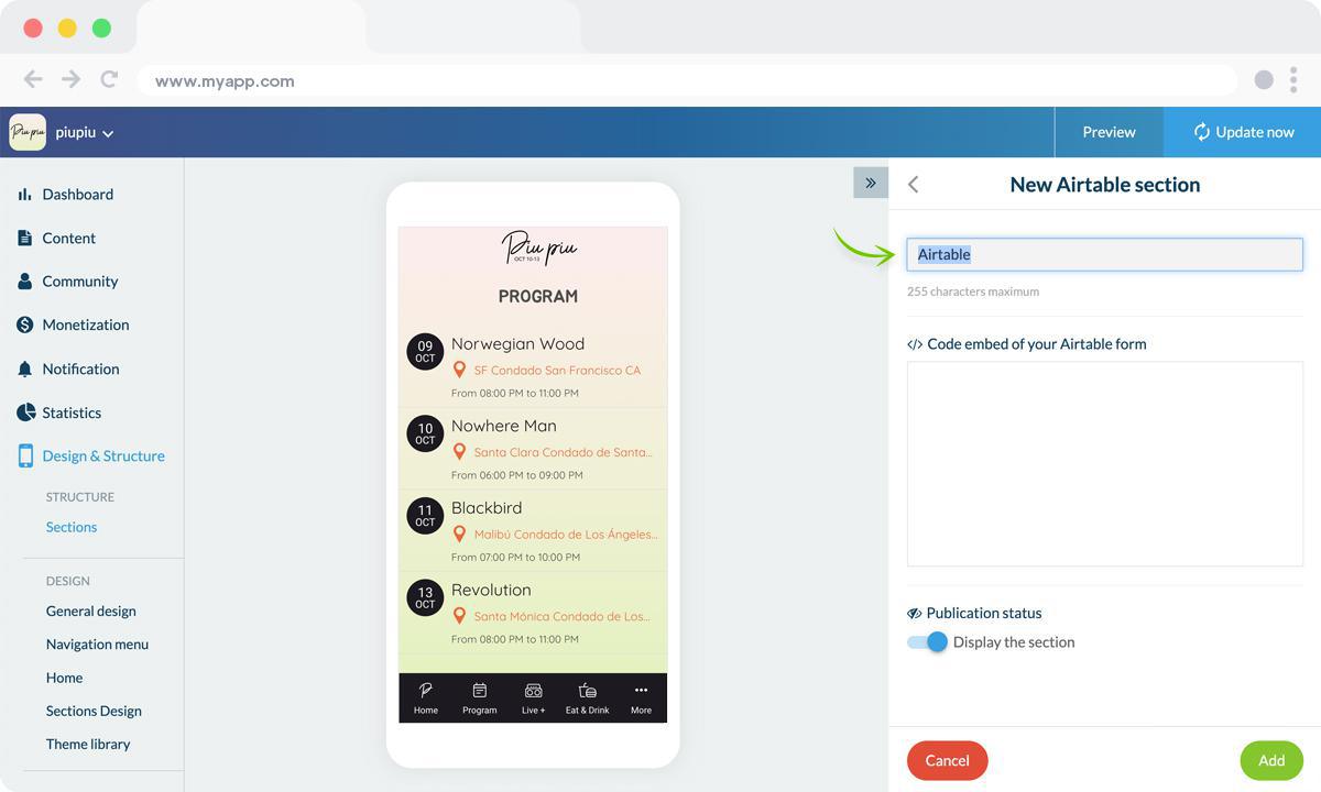 You will land on the editing panel of your new section. Rename your section, add the embed code of the form and choose where you want it to be displayed in your app menu. And it's done!