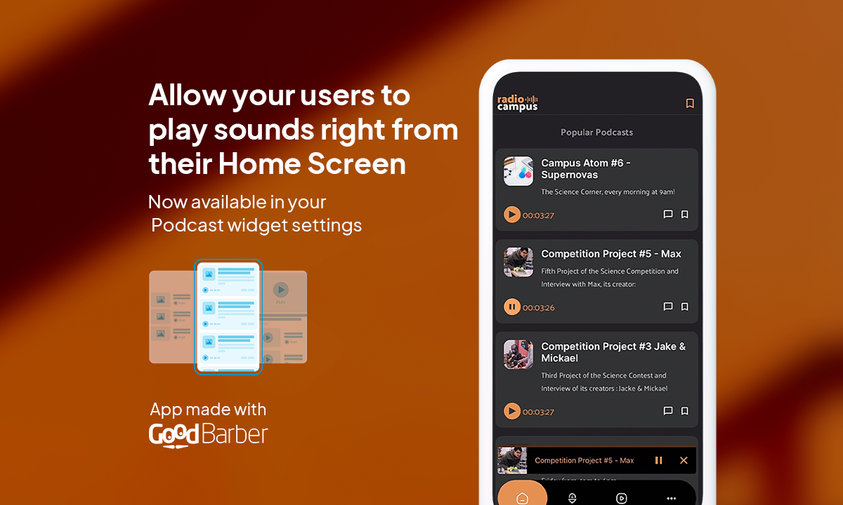 The new sound widget at GoodBarber is designed to simplify access to your audio content while enhancing the user experience. With the integration of a play button directly in each cell, users can start and control their audio without navigating away from the page, ensuring a smooth and continuous experience. This also activates the mini-player, which unfolds without interrupting the user's navigation, ensuring a seamless transition between different actions.