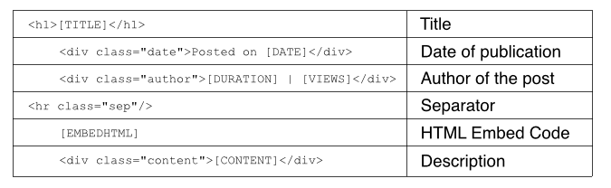 - [EMBEDHTML] : HTML embed code of the video (used only in the detail page of the video sections)