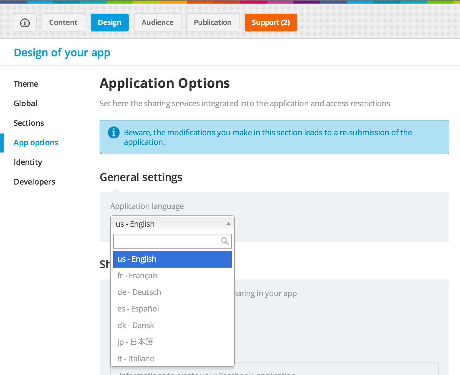 If you want, you can have a different language for your application than the one of your backend. To change it, go in your backend menu Design >> App Options >> General Settings and select the language of your application in the drop down menu.