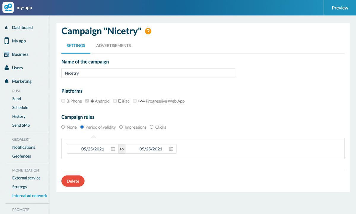 Remember that the internal ad network is just a tool. GoodBarber doesn't take part in the deal you make with the advertiser. Up to you to set your prices and your pricing model. GoodBarber will give data on impressions and clicks. You will be able to bill the advertiser on a CMP basis or on a CPC basis.