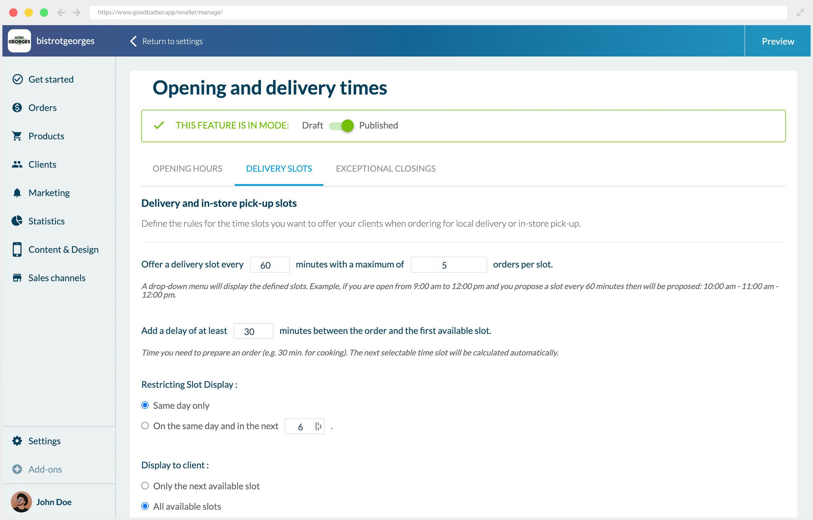 - Maximum of order per slot: you decide how many orders you can manage per time slot and set the number of orders that will be available to your clients.