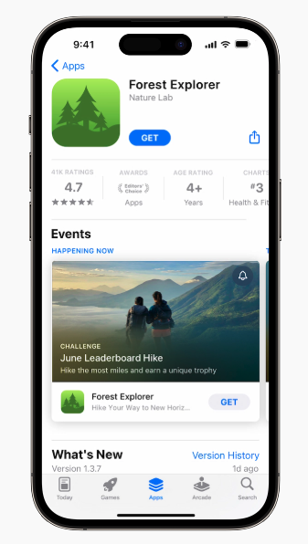From iOS 15 and iPadOS 15, your integrated events appear directly on the App Store in the form of attractive cards containing images or videos, a name and a short description. Clicking on a card takes users to a dedicated page offering an immersive experience with additional details and the option to share the event via Messages or social networks. They can also receive notifications when the event starts. If your app isn't installed, users can download it directly from the map or event page, and be redirected to the appropriate location in the app. These events appear on your product page, in search results, and in personalised or editorial recommendations in the Today and Apps tabs, maximising their visibility and impact.