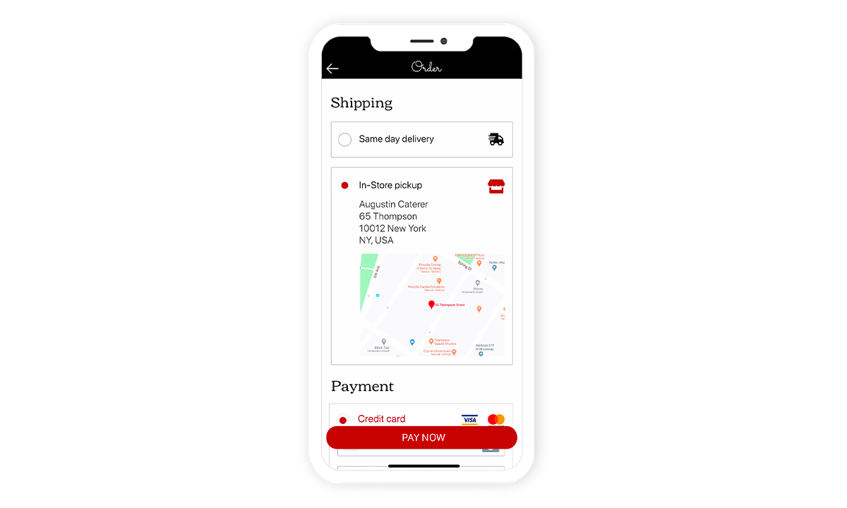 - On the checkout page, they simply select in-store pickup. Thanks to the Fast Checkout add-on, no other info to give or form to fill up. And they see automatically the restaurant location on a map.