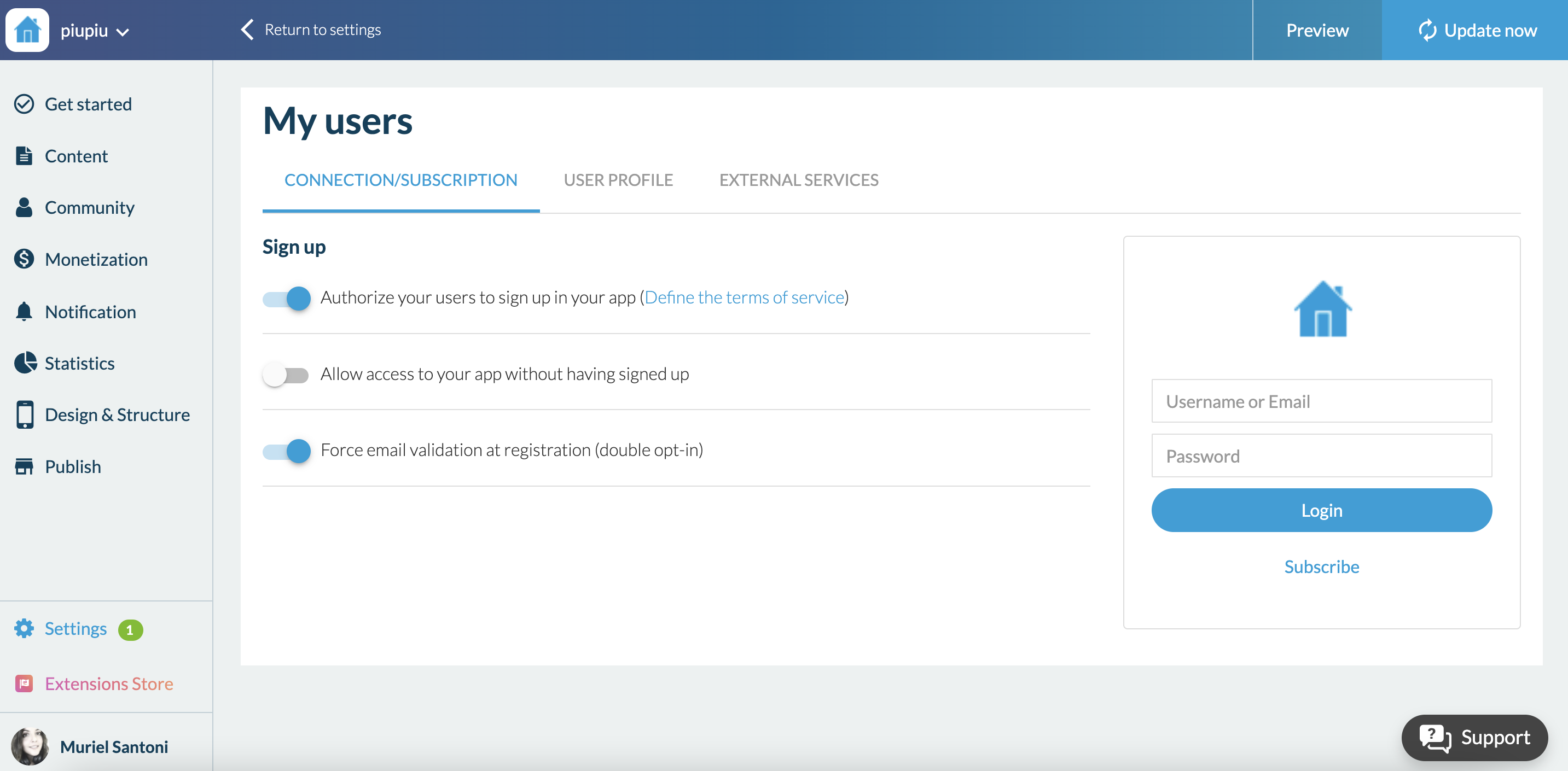 In your app back office, from the Setting menu (left-hand side) > Registration settings, click on " Registration process". This is where you set the user account creation option. In the connection > Sign up part, you can now activate the double opt-in.