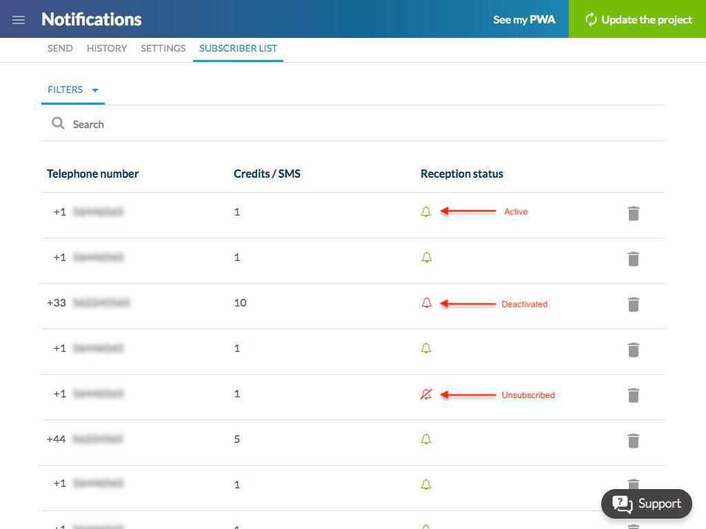 This list also allows you to identify users who have unsubscribed from the notification service. The phone numbers with the red icon with a slash through it are them. These users have sent STOP via SMS to unsubscribe.