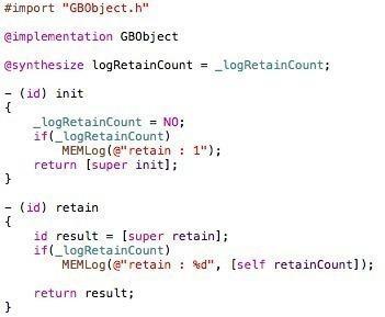 The implementation of this log is a bit more complex than the previous ones. We had to subclass certain native objects (NSObject, UIView, UIViewController, ...) to redefine their memory management functions (retain, release, init, dealloc). So, everytime one of these methods is called, a log with the "retainCount" of the object is displayed.